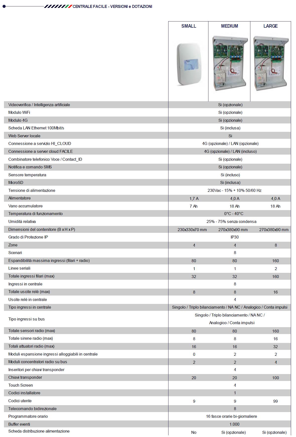 FACILE è disponibile in tre differenti versioni (Small, Medium e Large) e con la possibilità opzionale del Gateway di integrazione tra le Centrali FACILE e sistemi di videosorveglianza e videoregistrazioni analogici o IP per essere impiegata in applicazioni che vanno dal piccolo appartamento all’azienda.